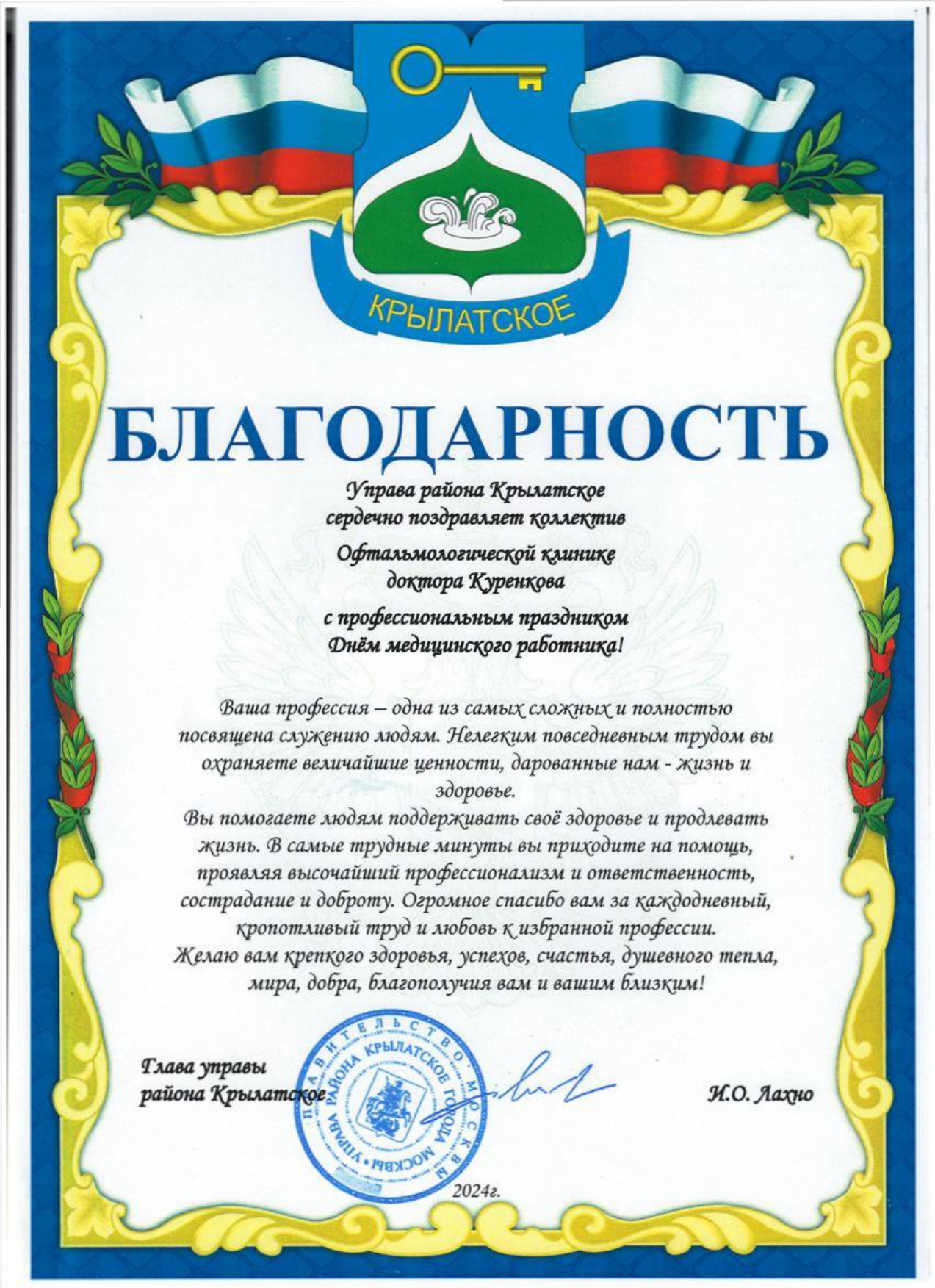 Вы помогаете людям поддерживать своё здоровье и продлевать жизнь. В самые трудные минуты вы приходите на помощь, проявляя высочайший профессионализм и ответственность, сострадание и доброту. Огромное спасибо вам за каждодневный, кропотливый труд и любовь к избранной профессии.