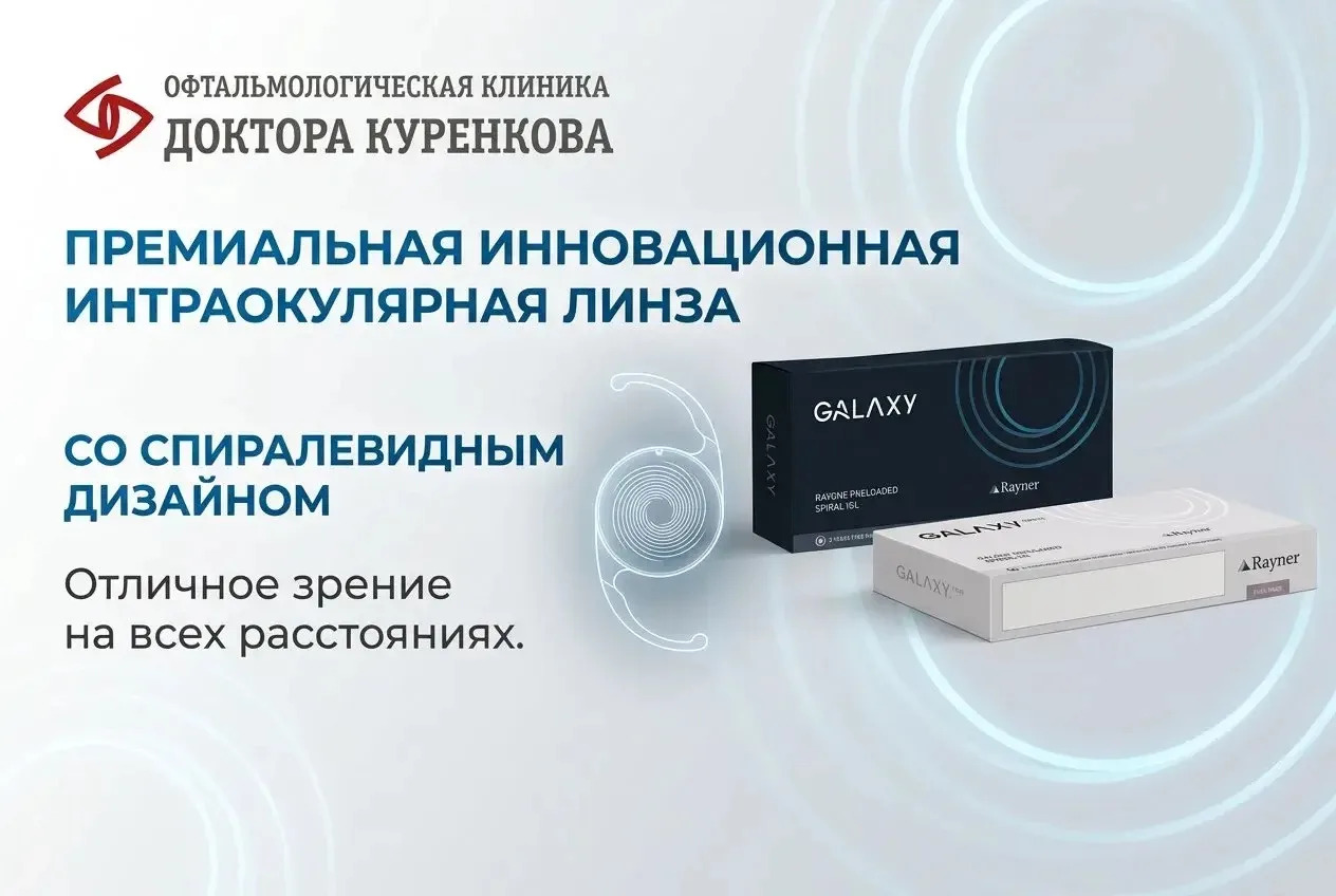 RayOne Galaxy (РэйУан Гэлакси) — первая в мире интраокулярная линза со спиральной оптикой. 100% света достигает сетчатки, отсутствие бликов и ореолов. Острота зрения вдаль — от 1,0 и выше. Торическая версия для астигматизма. Имплантация через микроразрез 2,2 мм. Подробнее в статье.